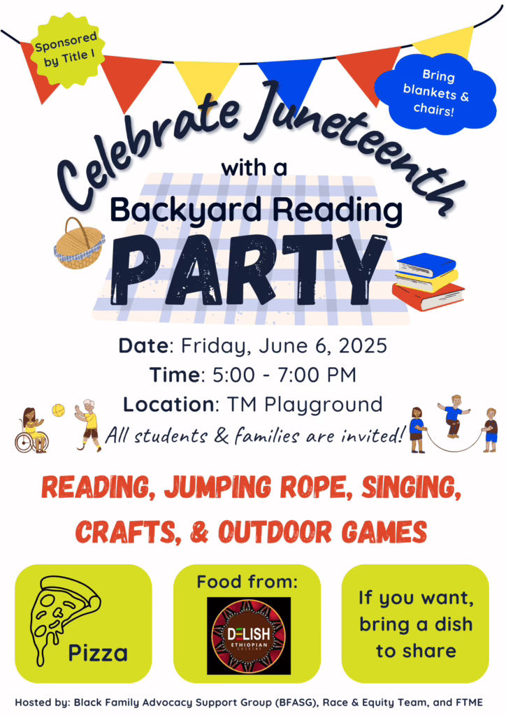 Celebrate freedom, community, and the joy of reading at our Backyard Reading Party on Friday, June 6, 2025, from 5:00โ7:00 PM at TM Playground!